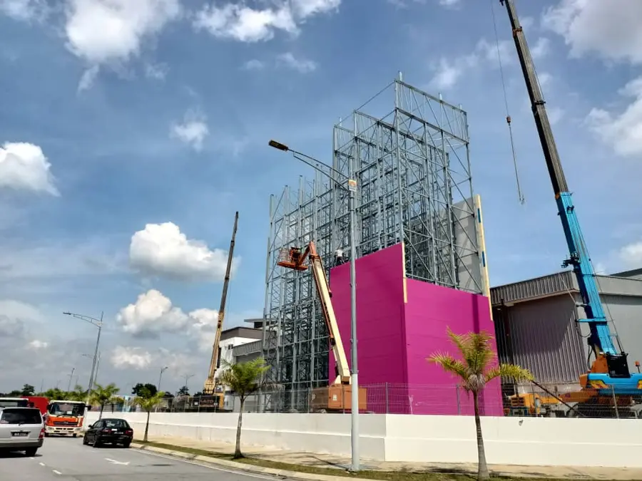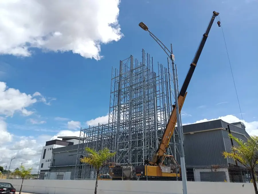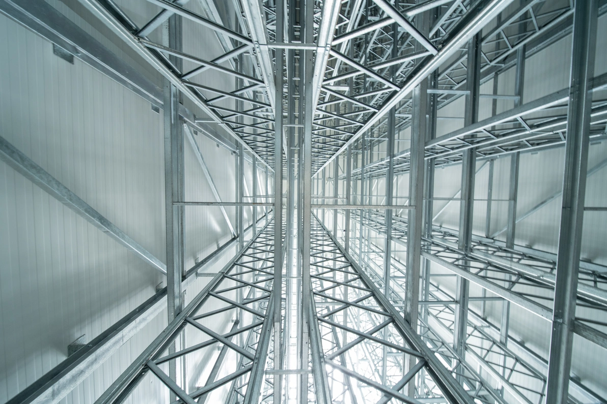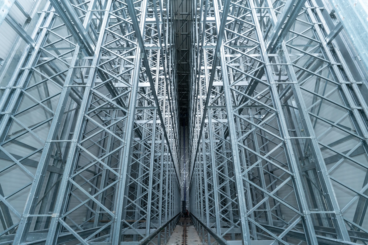 The system is built from the inside out where the racking structure supports the load of stored goods and also bears the load of the building envelope itself.