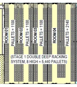 Pallet shuttle system- 6,600 pallet positions | Double deep storage – 5,400 pallet positions